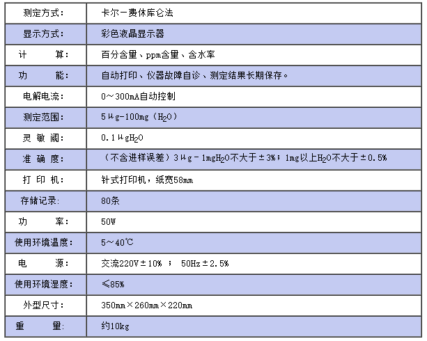 儀器符合GB/T7600及采用卡爾—費休法測定樣品中水分的有關標準,適用於石油化工產品、充油電器設備絕緣油及礦物原料等物質中水分的測定。 該儀器采用了大屏幕彩色液晶顯示,中文菜單,人機對話更直觀,操作更簡便,具有自動換算自動打印和保存測定結果等功能,與同類儀器相比,大大提高了測試靈敏度。